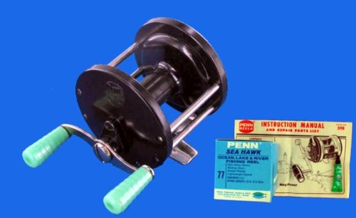 This is a vintage, Brand New in the Box, NEW OLD STOCK Penn SEA HAWK #77 Fishing reel. This reel features Penn's Bakelite sideplates and plastic spool. Double handle (colors, green or white will vary). This is a true classic and all of these reels are brand new. Buy it as a collector's piece or feel free to use it. These reels do not have an anti-reverse. Non-strip Gears Sliding Clicker Stainless Steel Pinion DON'T MISS OUT ON THIS RARE COLLECTORS REEL VERY LIMITED QUANTITY AVAILABLE.